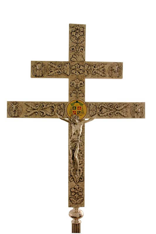 Davanti e dietro con motivi floreali, nel centro risalta lo stemma vescovile inciso e rifinito con smalti completa di base abbinata e cesellata Con lo stemma vescovile Realizzata per un vescovo del Camerun