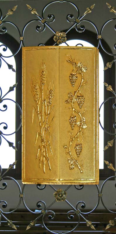 Tabernacolo cesellato a mano e rifinito con smalti a fuoco sulla portina dove spicca lo stemma del committente.